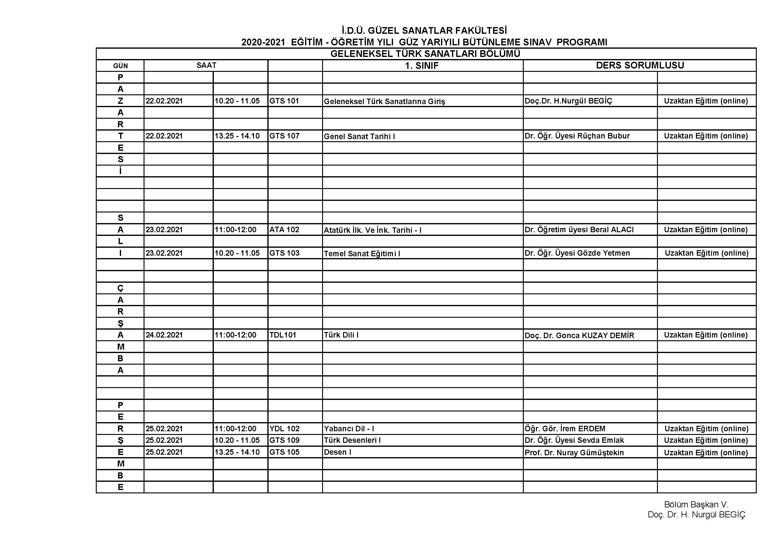 Geleneksel Türk Sanatları Bölümü 2020-2021 Güz Dönemi BÜTÜNLEME Sınavı Tarihleri