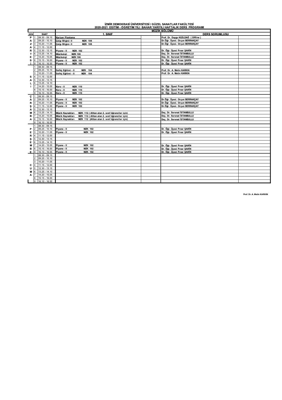 Müzik Bölümü 2020-2021 Bahar Yarıyılı 1. Sınıf Ders Programı için