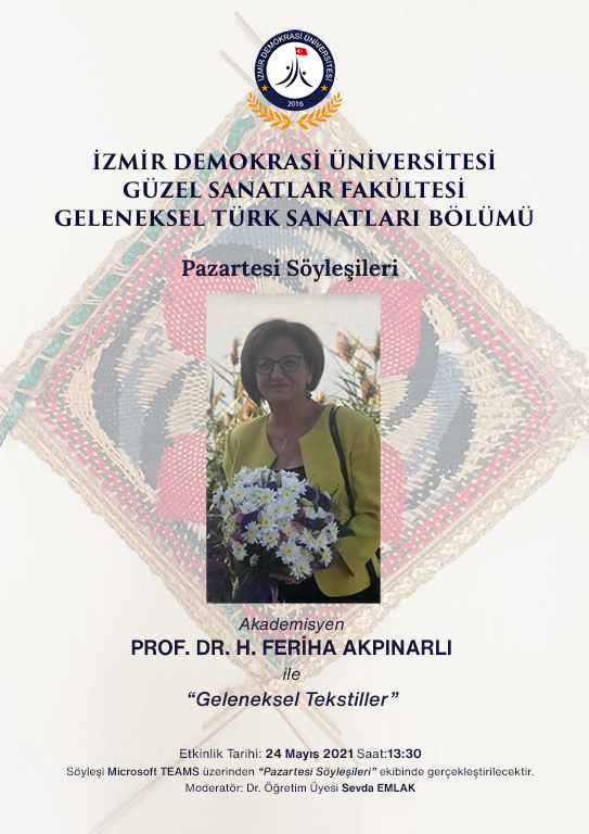 İzmir Demokrasi Üniversitesi Güzel Sanatlar Fakültesi Geleneksel Türk Sanatları Bölümü Pazartesi Söyleşileri etkinlikleri kapsamında Prof. Dr. H. Feriha AKPINARLI 24 Mayıs 2021 Pazartesi günü konuğumuz olacaktır.